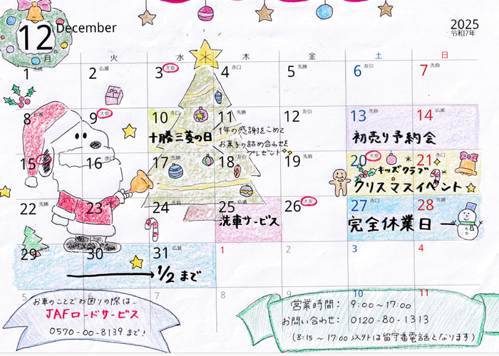 2025年 12月のカレンダー <GW、夏季、年末年始を除き、定休日はございません>![]() 2026年 1月のカレンダー <GW、夏季、年末年始を除き、定休日はございません> |