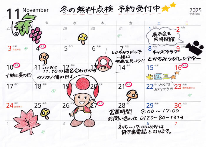 2025年 10月のカレンダー <GW、夏季、年末年始を除き、定休日はございません>![]() 2025年 11月のカレンダー <GW、夏季、年末年始を除き、定休日はございません> |