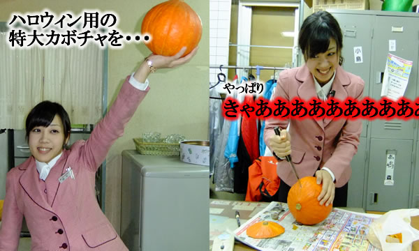 和洋折衷。 正月に、クリスマスに、ひなまつりに、ハロウィン。 日本にはお祝いする楽しいイベントがたくさんありますね♪ さあ、今月のイベントは「ハロウィン」です☆ 今日は特大カボチャをくり抜いて、ハロウィン用の「ジャック・オ・ランタン(ジャックのちょうちん)」づくりをしました。 本番は10月31日(月)ですが、十勝三菱では週末の29日(土)・30日(日)に楽しいイベントを開催しますので、ぜひご来店お待ちしています★