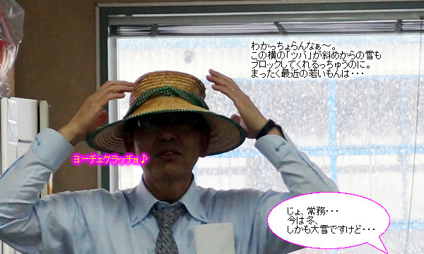 雪や寒さに弱い東京に対して、北国からモノを言う態度のことを『北から目線』と呼ぶらしい…ということを、先日知りました。 ある人がいうには、東京の「XXcmの雪」は 「XXcmの冠水」に近いという解釈だとか・・。 ですから今回の雪は相当ひどかったというのは想像出来ます。東京の雪害と北国のそれは全くの別物なんですよね。 横なぐりの大雪なのに、麦わら帽子はまさに南の人からみて「北から目線」?