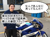 自他ともに認める車好きの高橋スタッフ(通称カズオ)。 でもたまに気分転換でバイクに乗ることもあります。今日は、お休みの中、自慢のバイクでちらっと会社へ。 すると、なんとそこには紺野スタッフのピカピカに輝く青いバイクが!! 「か、かっこいい・・・」 「で、でも俺の方がか、か、かっこ・・・・・」 「ねえ、乗せてもらっていい?」 カズオと紺野。 バイクと車。 みんなちがって、みんないい。