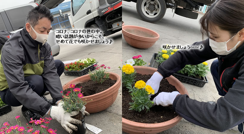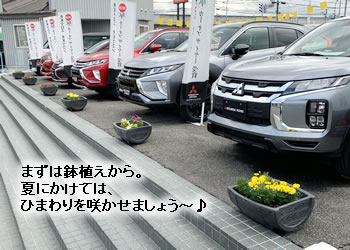 十勝三菱には様々な「委員会」があります。 その中でもはじめて聞いた方が「???」となるのが 「ひまわり委員会」です。 ミッションは、その名の通り「ひまわりで構内をいっぱいにして明るい空気を生み出すこと」なのですが、ひまわりは時期が限られているので、春〜初夏は鉢植えをデコレーション♪ 冬にはアイスキャンドルなどで構内を彩ります。 花は生き物なので、毎年苦労しながらも社内を明るく演出してくれるナイスなひまわり委員会です。