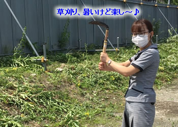 社屋の裏側にある社員用駐車場のフェンス沿いの草たちが、大きく育ってきました。 そこで、今日は天気も良いので草刈りです。 まずは近くに止まっている車を移動。 スペースを確保して、芝刈り機をスタート! ウィ〜〜〜ン! バサバサバサバサ ガキッ!! 「いてっ!!」 悪戦苦闘しながらでしたが、とってもきれいになりましたとさ。 めでたし、めでたし♪